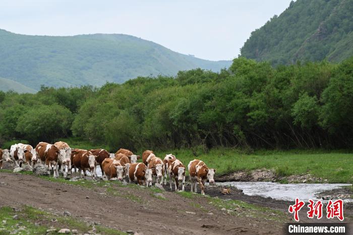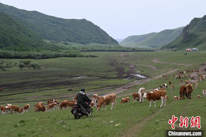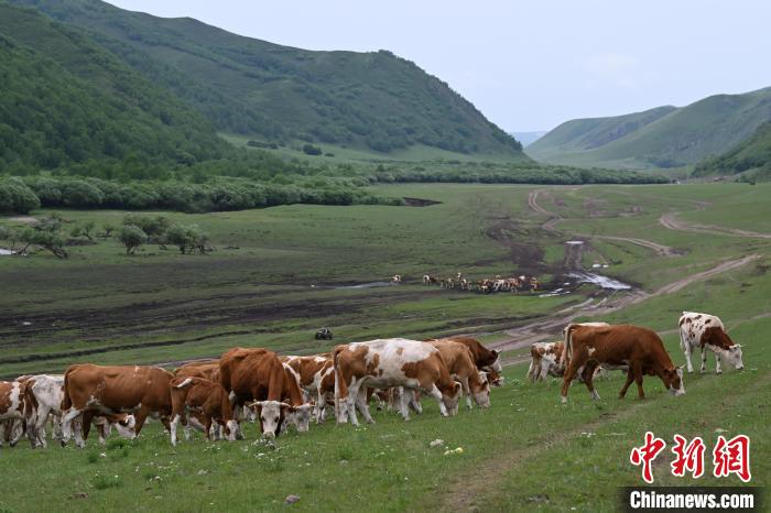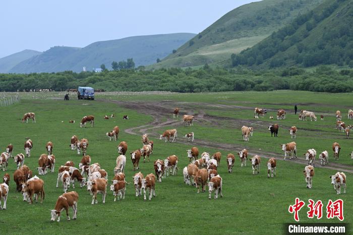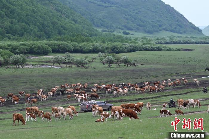 6月15日,内蒙古通辽市扎鲁特旗,牛群在转场途中悠闲吃草,当地为山地草原,地形多有起伏。中新社记者 刘文华 摄