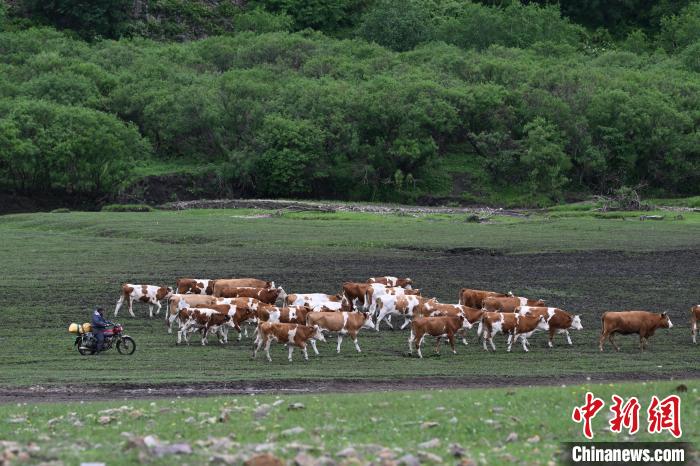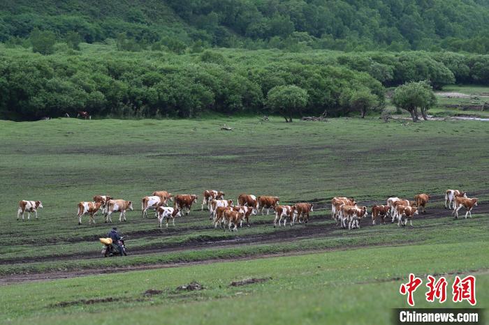 6月15日,内蒙古通辽市扎鲁特旗,牧民骑摩托车赶牛转场。中新社记者 刘文华 摄